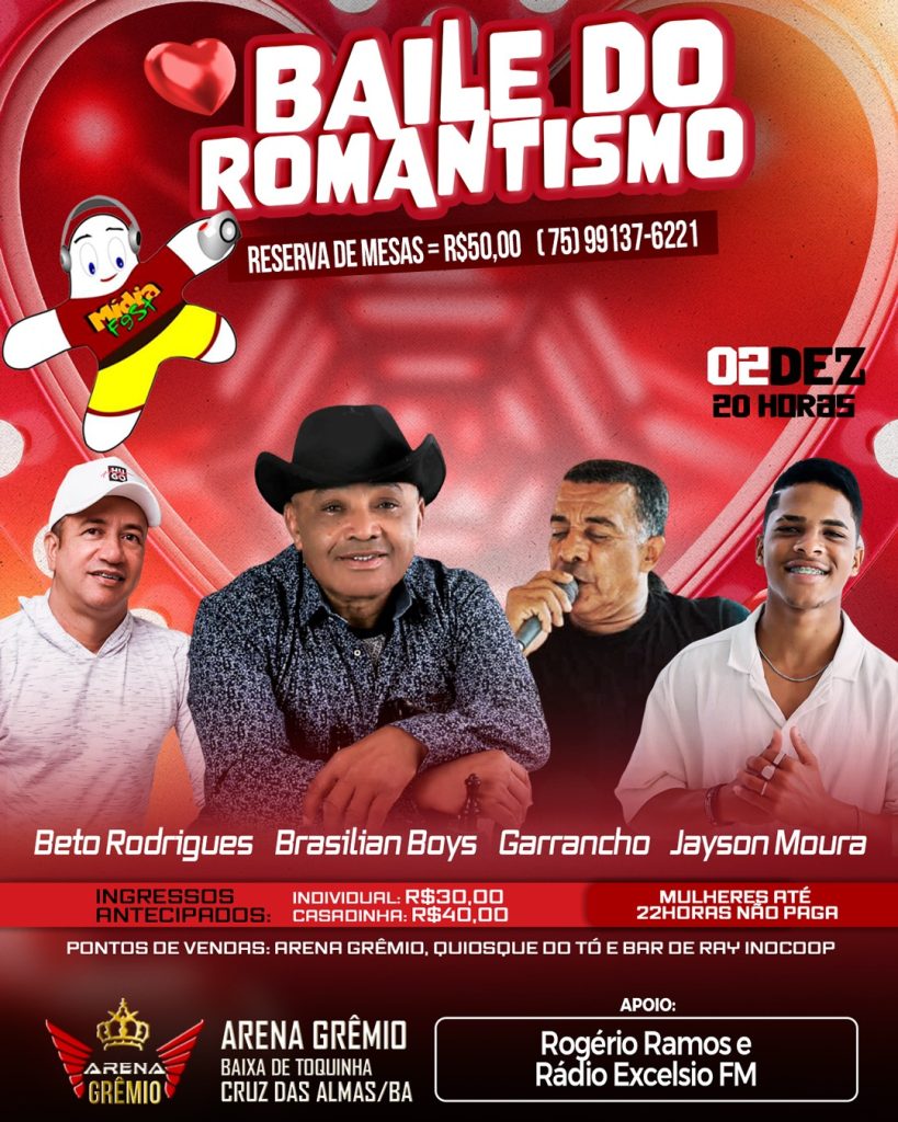BAILE DO ROMANTISMO ❤️📍LOCAL: Arena Grêmio – Cruz das Almas🗓 DATA: Sábado, 02 de Dezembro/2023⏱️ HORÁRIO: 20h00 ATRAÇÕES:Brasilian Boys | Beto Rodrigues | Garrancho | Jayson Moura. 🎫 INGRESSOS:▪️ Individual: R$ 30,00▪️ Casadinha: R$ 40,00📱 Whatsapp (75) 99137-6221 #BaileDoRomantismo #ArenaGrêmio #BrasilianBoys #BetoRodrigues #Garrancho #JaysonMoura #Eventos #Música #CruzDasAlmas #MidiaFest