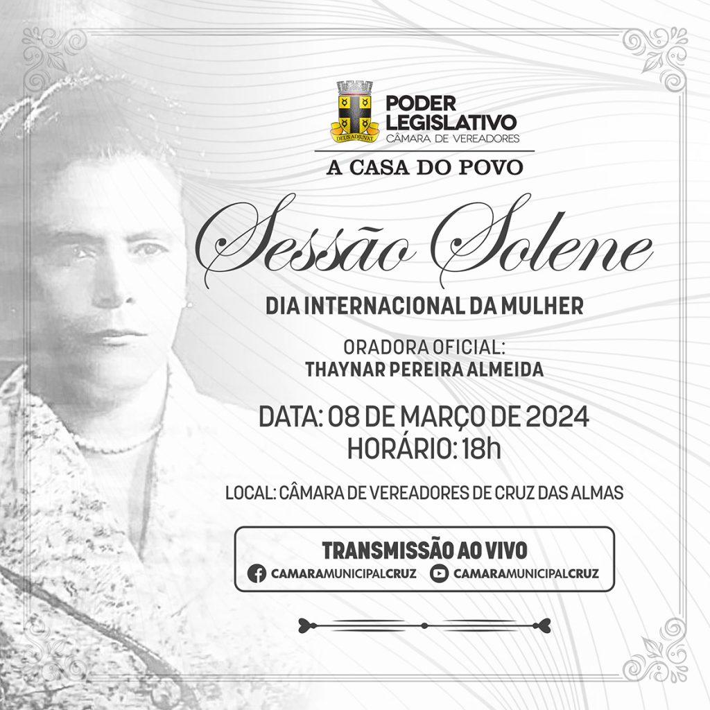 A Câmara de Vereadores de Cruz das Almas realiza na próxima sexta-feira, 08, às 18h, a Sessão Solene em homenagem ao Dia Internacional da Mulher. Na ocasião, 17 personalidades femininas serão condecoradas com a Comenda Dina Passos. A oradora oficial da sessão será Thaynar Pereira Almeida. Mecânica, a jovem de 22 anos, se orgulha do […]