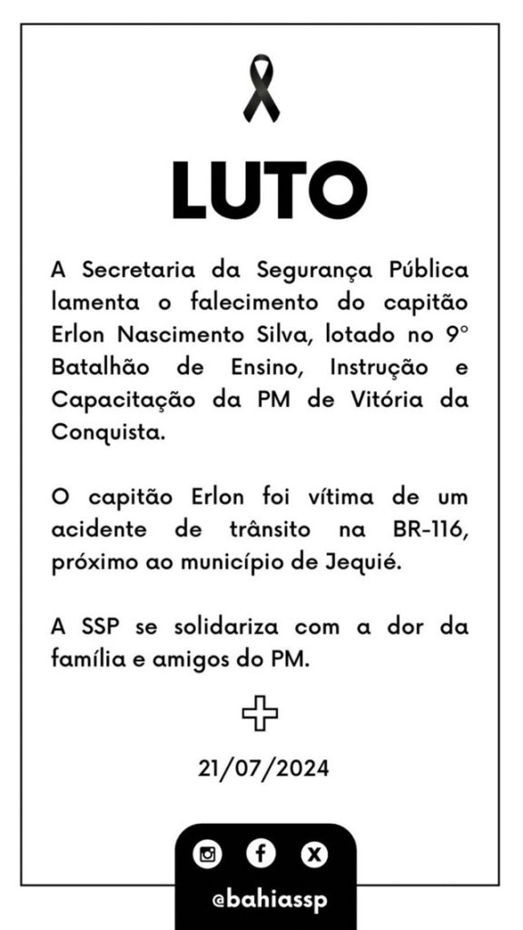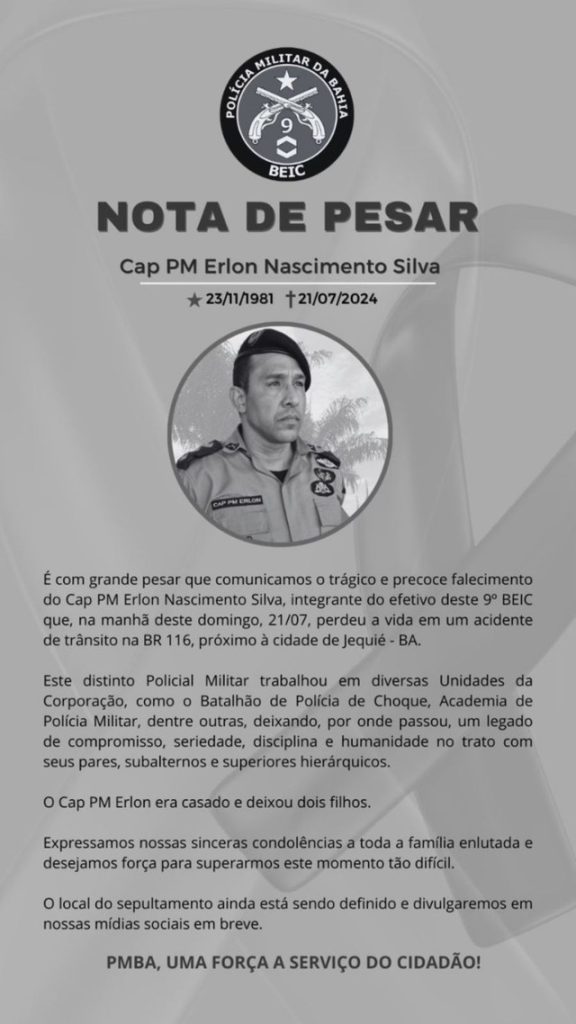 É com grande pesar que comunicamos o trágico e precoce falecimento do Cap PM Erlon Nascimento Silva, integrante do efetivo deste 9º BEIC que, na manhã deste domingo, 21/07, perdeu a vida em um acidente de trânsito na BR 116, próximo à cidade de Jequié-BA.