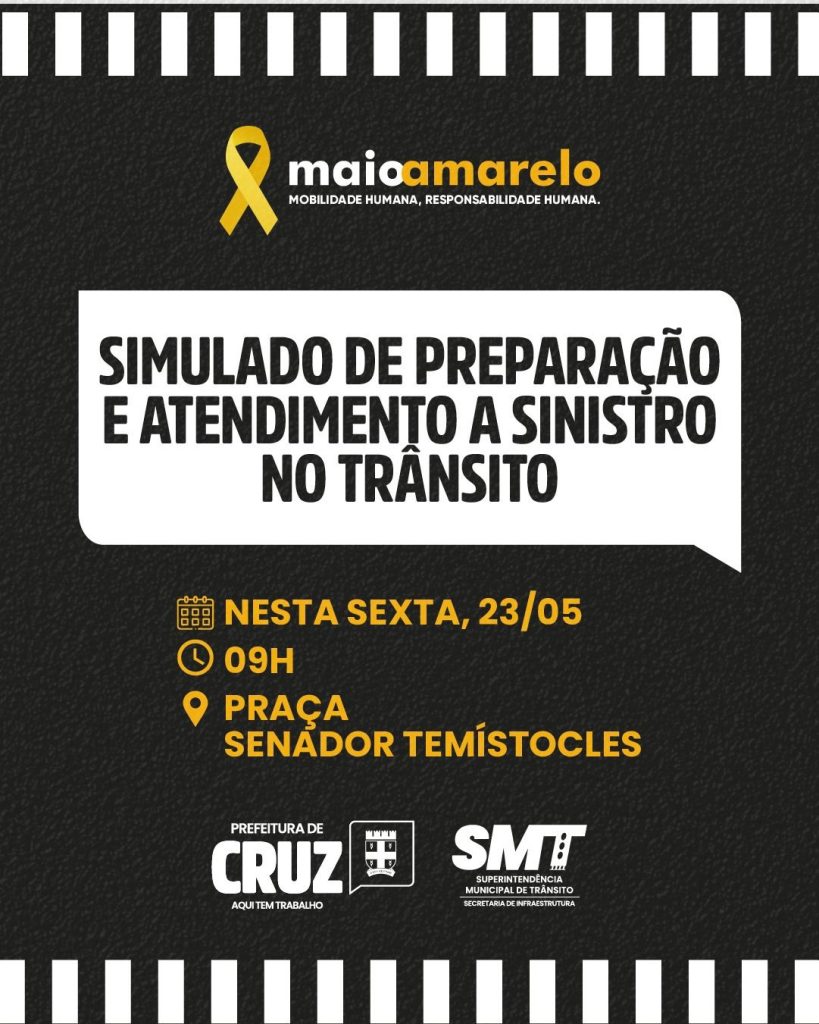 Como parte das atividades do Maio Amarelo, a Prefeitura de Cruz, por meio da Superintendência Municipal de Trânsito (SMT), vai realizar um simulado de preparação e atendimento a sinistro no trânsito na Praça Senador Temístocles, às 9h. No local, será encenada uma situação real de emergência e operação de resgate. A ação contará com a […]