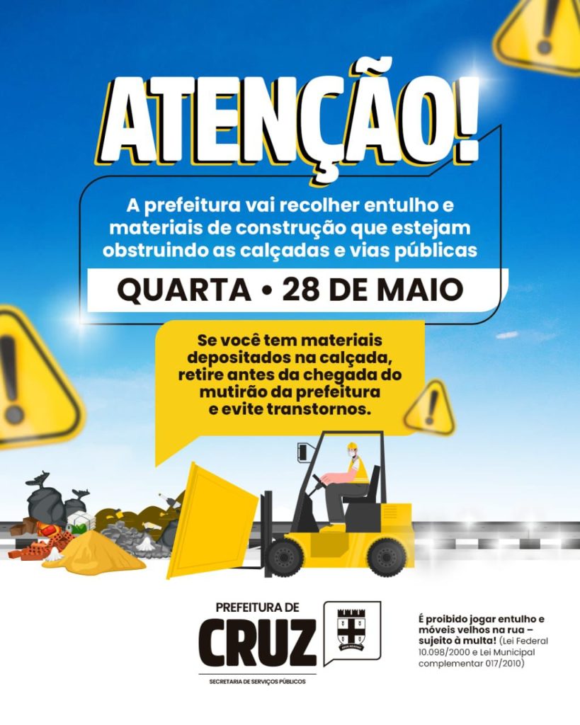 A Prefeitura de Cruz, por meio da Secretaria de Serviços Públicos, inicia na próxima quarta-feira (28) um mutirão de coleta de entulhos depositados irregularmente nas ruas da cidade. Além de entulhos, as equipes também irão recolher materiais de construção que estiverem obstruindo calçadas e vias públicas. A ação busca manter a cidade limpa, organizada e […]