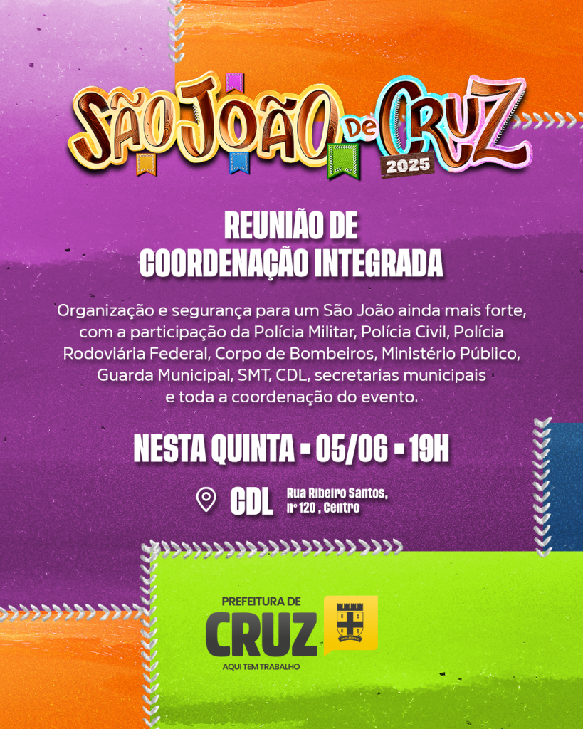 A Prefeitura de Cruz convida os representantes dos estabelecimentos comerciais da cidade para uma reunião de coordenação integrada sobre o São João 2025. A reunião será realizada nesta quinta-feira (05), às 19h, na CDL, que fica na Rua Ribeiro Santos, nº 120, Centro. Além dos comerciantes, o encontro terá a participação da Polícia Militar, Polícia […]