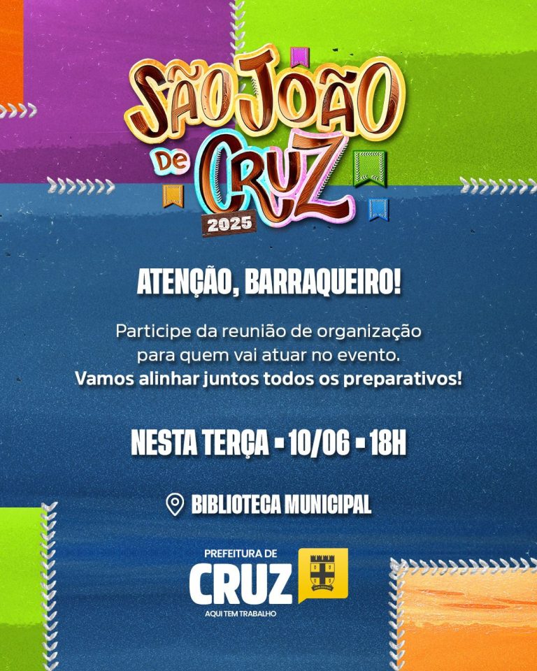A Prefeitura de Cruz realizará, nesta terça-feira (10), uma reunião com todos os barraqueiros de alimentos e bebidas que efetuaram o recadastramento para o São João deste ano. O encontro acontecerá às 18h, na Biblioteca Municipal.