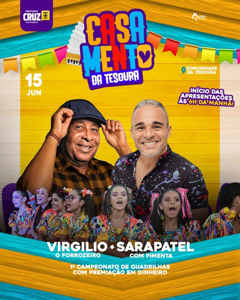 Neste domingo (15), a alegria vai tomar conta do bairro da Tesoura com a realização do tradicional Casamento da Tesoura. Com apoio da Prefeitura de Cruz, o evento promete um dia inteiro de animação, cultura e muito forró, reunindo moradores e visitantes em um grande festejo junino.
