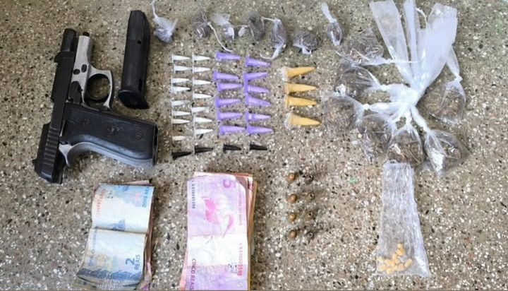 No local da ação, os policiais apreenderam uma pistola .380, um carregador com oito munições, além de entorpecentes: 35 pinos de cocaína, 14 papelotes de maconha, 14 pedras de crack e R$ 720 em espécie.
