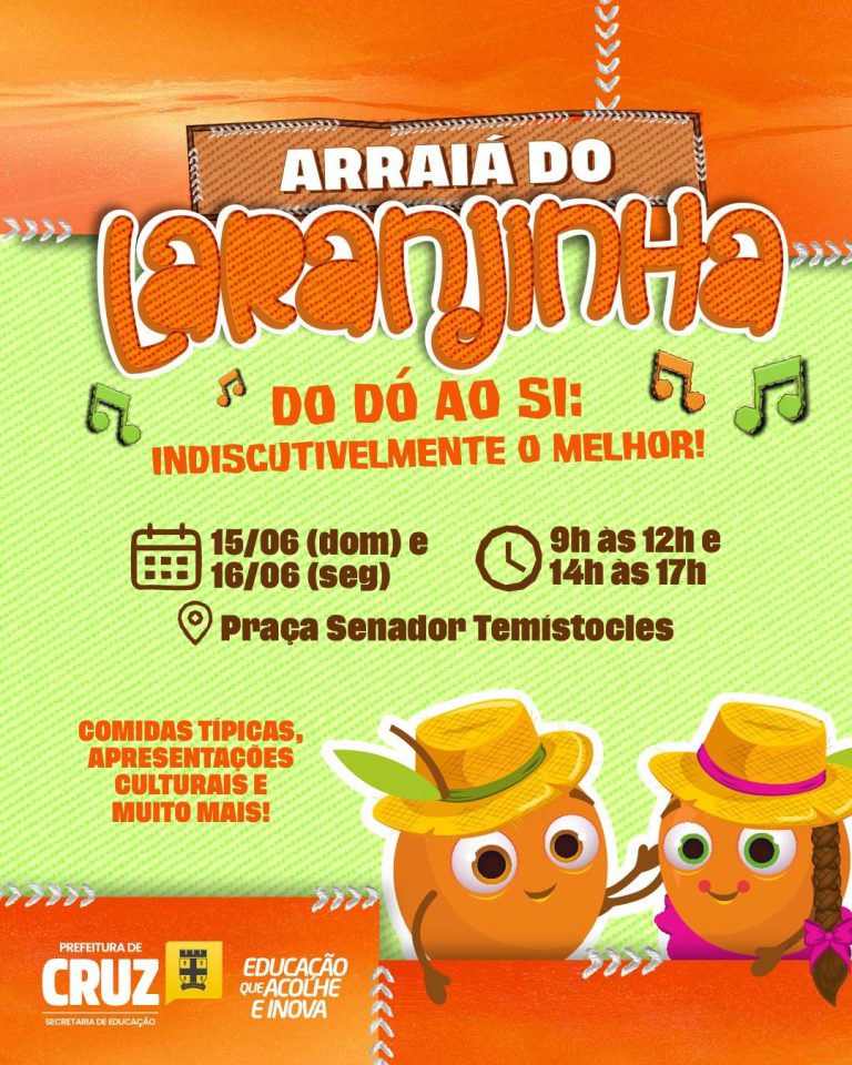 Realizado pela Prefeitura de Cruz, por meio da Secretaria de Educação, o Arraiá do Laranjinha vai começar neste domingo (15). As apresentações serão realizadas das 8h às 17h na área em frente ao Paço Municipal, na Praça Senador Temistocles. A programação continua na segunda-feira (16).