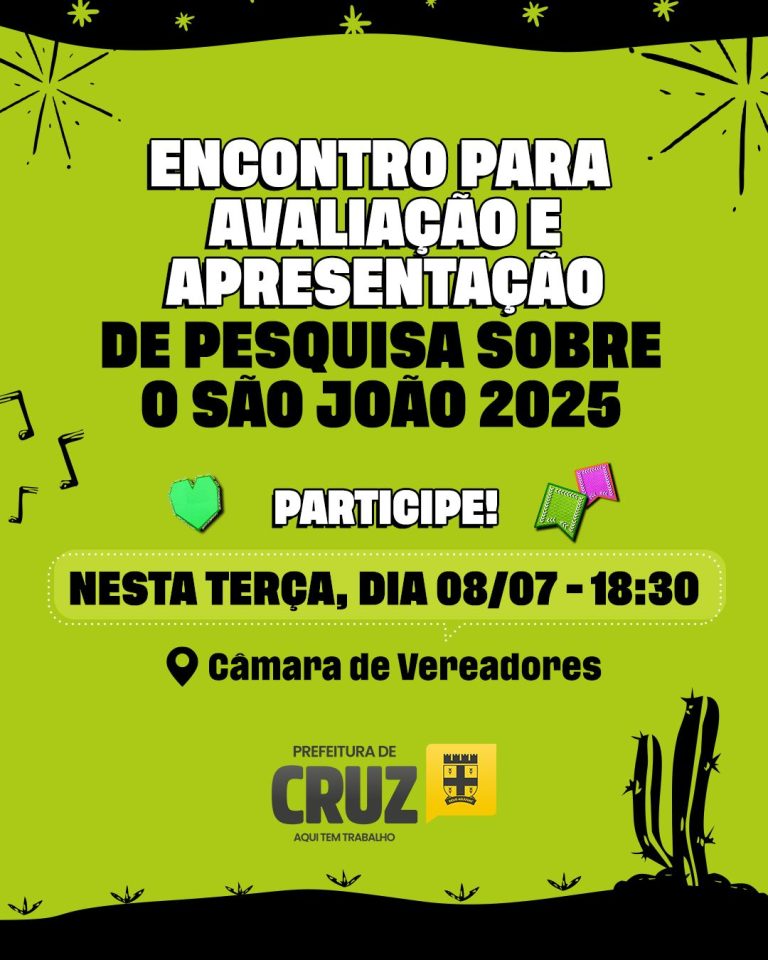 A Prefeitura de Cruz apresentará, nesta terça-feira (08), o resultado da pesquisa realizada sobre o São João 2025. O encontro de avaliação acontecerá na Câmara de Vereadores, às 18h30, com a participação do prefeito Ednaldo Ribeiro, do vice-prefeito e coordenador do São João, Ronivon Carvalho, e da equipe de governo. A imprensa, entidades parceiras, empresários, comerciantes da cidade e a população em geral estão convidados a participar desse importante momento de análise e planejamento.
