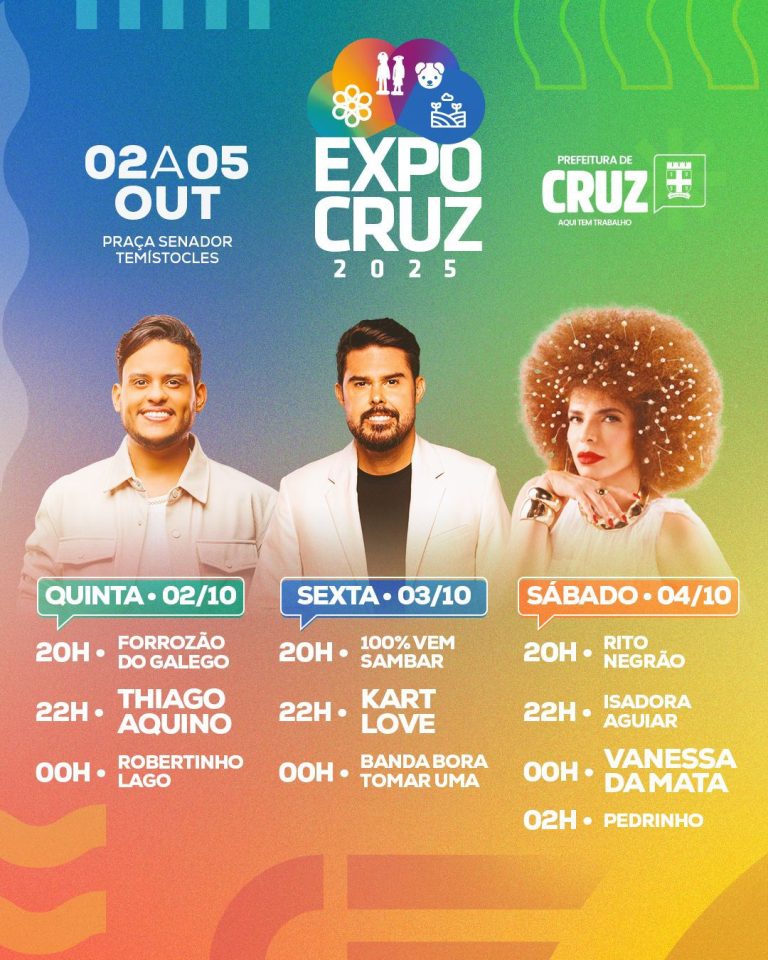 Grandes shows vão agitar as noites da ExpoCruz deste ano. A Prefeitura de Cruz, por meio da Secretaria de Cultura e Turismo, preparou uma grade de atrações especial, pensada para agradar a toda a família. A programação cultural da festa acontecerá nos três primeiros dias do evento, a partir do dia 2 de outubro, e contará com uma diversidade de ritmos.