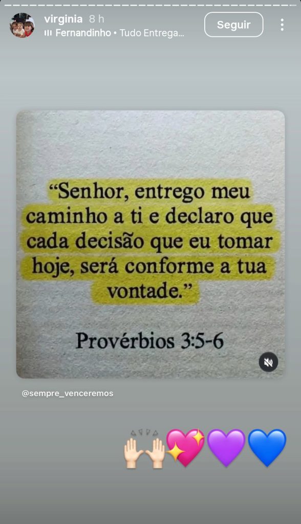 “Senhor, entrego meu caminho a ti e declaro que cada decisão que eu tomar hoje será conforme a tua vontade”, escreveu Virginia, citando o versículo de Provérbios 3:5-6. A postagem foi acompanhada do louvor Tudo Entregarei, de Fernandinho, reforçando o tom de reflexão e fé.