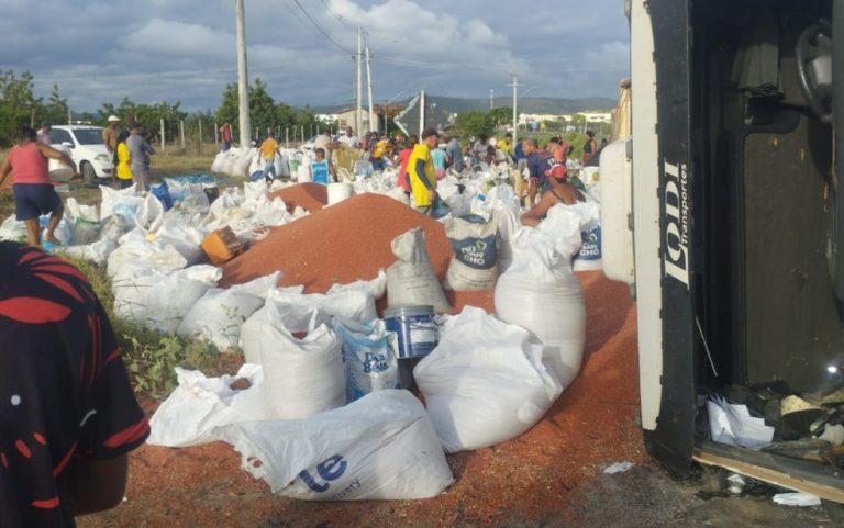 Imagens registradas no local mostram pessoas que passavam pela rodovia saqueando a carga de grãos espalhada após o acidente. Segundo a PRF, quando a equipe chegou ao trecho, todo o material já havia sido levado.