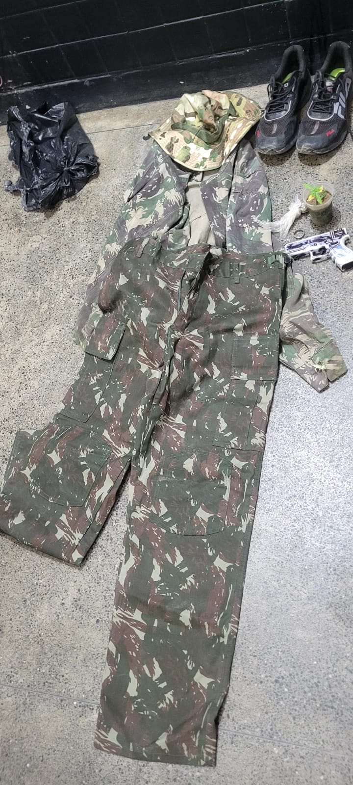 Durante a busca no interior da residência, os policiais encontraram um simulacro de arma de fogo, vestimentas camufladas e uma pequena quantidade de substância análoga à maconha.